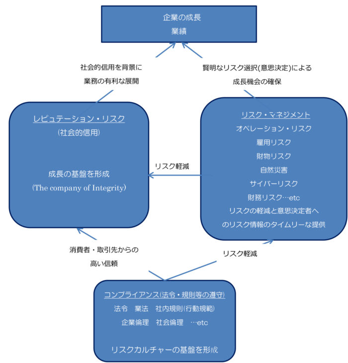 「リスクマネジメントの構造」 企業のリスクマネジメント・システムは、コンプライアンス(法令・規則等の遵守)、レピュテーション・リスク、リスクマネジメントの三つに分けて考えるのが簡明です。コンプライアンスの遵守体制が確立している企業は、必然的に社会的信用(レピュテーション)が増し業務を有利に展開できます。また、リスクマネジメントに対しても、業務の最前線で各種のリスクに直面するスタッフの各種法令、規則への遵守体制が確立しているので、リスクの軽減が実現できます。其の上でのリスクマネジメント体制の確立は、組織全体のリスクに対する対応力を向上させ、業績目標達成の確率を上げることが可能になります。さらに、この体制の確立は、リスクマネジメントのもう一つの重要な目的である『賢明なリスク選択(risk-taking)』に大きく貢献することが出来ます。企業内で行われる意思決定者にその決定の実行段階で待ち受けるリスクに関す情報をタイムリーの提供することにより、その判断を成功確率の高いものにすることが出来ます。